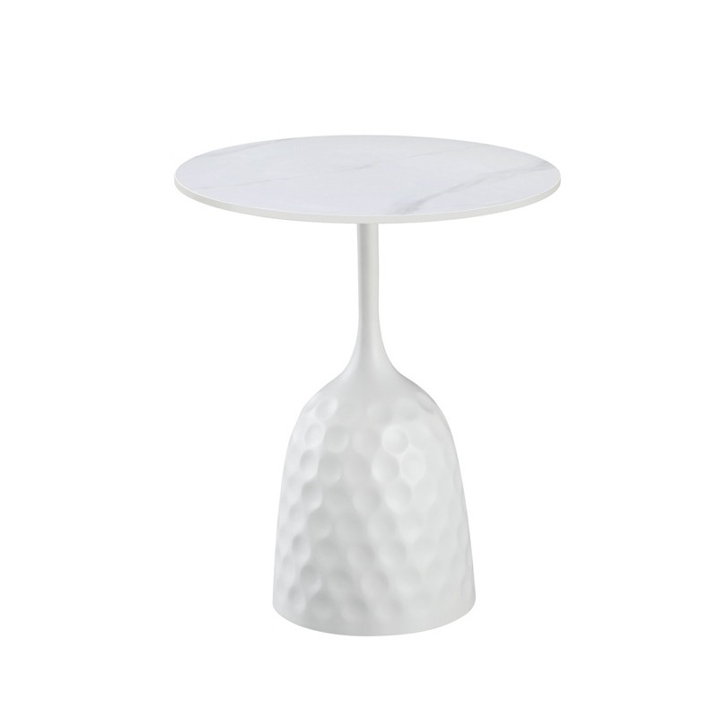 -Base de metal com acabamento branco, tampo de cerâmica imitando mármore branco.